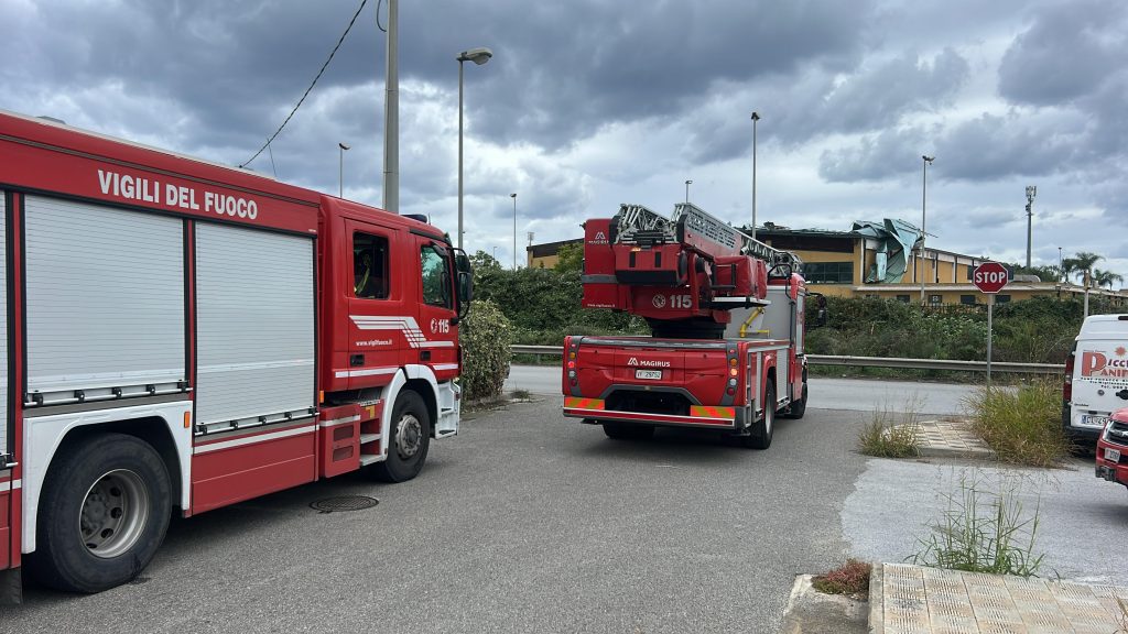 Le forti raffiche di vento hanno trascinato i grossi fogli di lamiera all’interno del cortile e nei balconi dei palazzi del Condominio “Primula” dirimpetto all’impianto. Per fortuna nessuno è rimasto ferito.