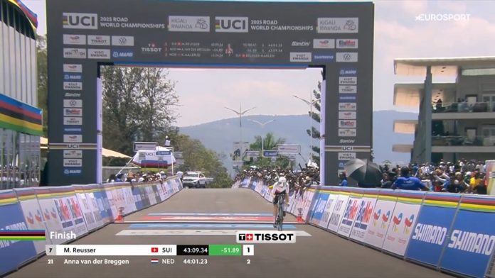 Kigali – Marlen Reusser ha finalmente completato la sua collezione. Dopo tre medaglie conquistate nelle edizioni passate, la campionessa svizzera si è presa l’oro iridato nella cronometro donne élite ai Mondiali di Kigali 2025. Sul percorso di 31,2 km, l’elvetica ha fatto la differenza sin dai primi intermedi, costruendo un margine incolmabile per le rivali e tagliando il traguardo con il tempo di 43’09”. Alle sue spalle, due nomi che hanno scritto pagine importanti del ciclismo neerlandesi, Anna Van Der Breggen, rientrata quest’anno alle competizioni dopo il ritiro, ha colto un prestigioso argento, accusando un ritardo di 52 secondi. Più staccata Demi Vollering, bronzo a 1’05”, che conferma ancora una volta la profondità del movimento ORANGE. Per l’Italia, la migliore è stata Monica Trinca Colonel, che ha chiuso in 11a posizione a 3’02” dalla vincitrice, restando appena fuori dalla top10 ma confermando una crescita costante nella disciplina. Più indietro Soraya Paladin, che ha terminato la prova al 26º posto con un distacco di 5’27”.