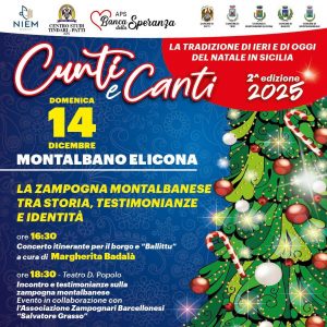 Domenica 14 dicembre, invece, sarà la giornata dedicata alla tradizione musicale natalizia con la seconda edizione di Cunti e Canti – La tradizione di ieri e di oggi del Natale in Sicilia, promossa da NIEM Eventi, Centro Studi Tindari – Patti APS, APS Banca della Speranza e dai Comuni di Patti, Terni, Montalbano Elicona, Basicò e Raccuja.