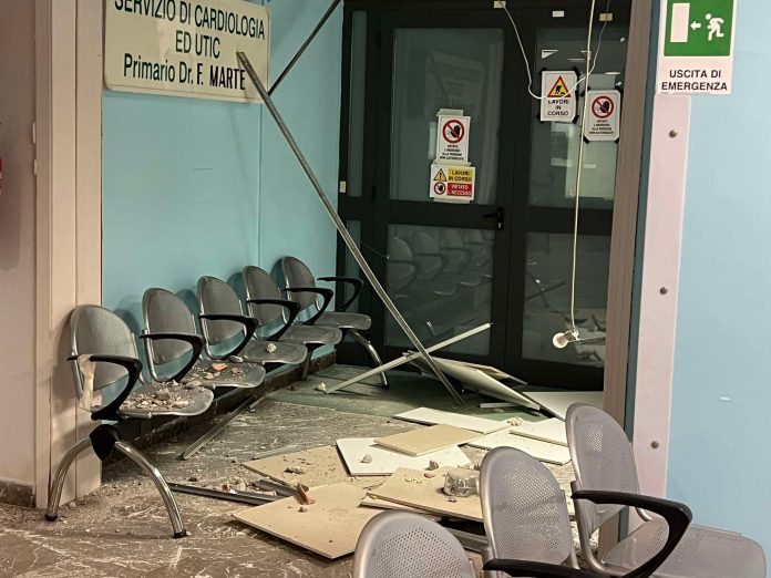 Il forte vento di scirocco che da ieri sera si è abbattutto sulla città di Milazzo ha provocato diversi danni . Oltre alla caduta di alberi sull’asse viario e in via Tommaso De Gregorio, si è registrato il crollo del tetto del reparto di Cardiologia e Utic dell’ospedale “Fogliani”. Come testimonia un video pubblicato sui social dai vertici di Sud chiama Nord a cedere sono stati alcuni pannelli di cartongesso sui seggiolini in un momento in cui non transitava nessuno poiché e’ accaduto di domenica sera quindi quando l’accesso verso il laboratorio di analisi era chiuso e non c’era nessuna maestranza nel cantiere che per ora sta interessando il presidio.