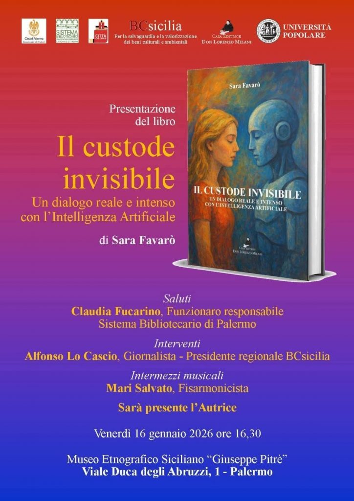 La presentazione avrà luogo domani venerdì 16 gennaio 2026 alle ore 16,30 presso il Museo Etnografico Siciliano “Giuseppe Pitrè” in Viale Duca degli Abruzzi, 1 a Palermo. Il libro è edito dalla Casa Editrice Don Lorenzo Milani. Dopo i saluti di Giampiero Cannella, Assessore comunale alla Cultura e di Claudia Fucarino, Funzionario responsabile del Sistema Bibliotecario di Palermo, è previsto l’intervento di Alfonso Lo Cascio, Giornalista e Presidente regionale BC sicilia. Sono programmati Intermezzi musicali a cura della Fisarmonicista Mari Salvato. Sarà presente l’Autrice.