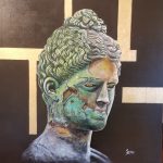 Anche gli oggetti fanno pare della sua svariata produzione, le anfore, il cratere, il capitello stesso sono dettagliati e sono tinti nei colori tipici dei periodi storico-artistici di appartenenza. In quanto allo splendido ultimo lavoro in cui la sincronicità artistica della pittrice si evidenzia senza esitazioni per la peculiarità di scolpire con la pittura, si tratta dell’innesto della testa della statua di Artemisia del Pireo del IV secolo, in una composizione di inserti di juta su una tela altamente contemporanea.