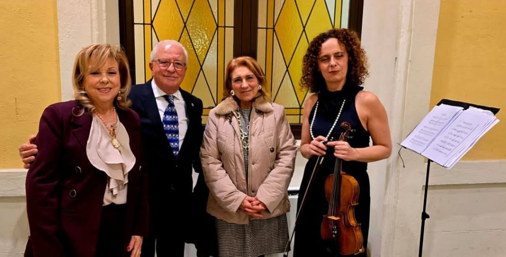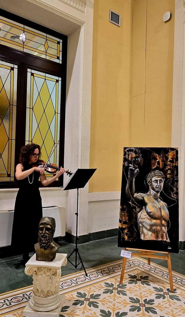 La visita in sala è stata allietata dall’esecuzione delle “Gnoesienne”, composizioni che si collegano al mito di Teseo edelle Gymnopedie di Satie. Le musiche in origine accompagnavano nelle festività spartane danze o esercizi ginnici senza armi, seguite da canti. Tali composizioni sono state una mirata e pertinente scelta della violinista calabra Paola Russo, che le ha mirabilmente eseguite e opportunamente rielaborate per il solo violino.
