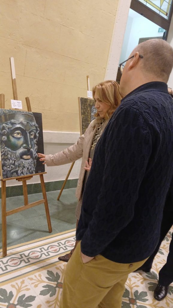 Presenti in sala anche alcune figure di rilievo quali la Critica d’Arte Sonia Demurtas e il Gallerista Francesco Logoteta. Le opere di Elvira Sirio dalla pittura su tela di juta riproducono, reinterpretandole, le sculture dell’antica Grecia, in primis i Bronzi di Riace, rappresentano un viaggio di riscatto del Mare Nostrum dalla tristezza della storia, alla riscoperta delle radici culturali magno-greche e classiche del territorio calabrese. Artisticamente si costituiscono come un dialogo ben riuscito tra archeologia e l’arte contemporanea. I lavori esposti nella Sala Boccioni hanno attratto il pubblico e destato vivo interesse.