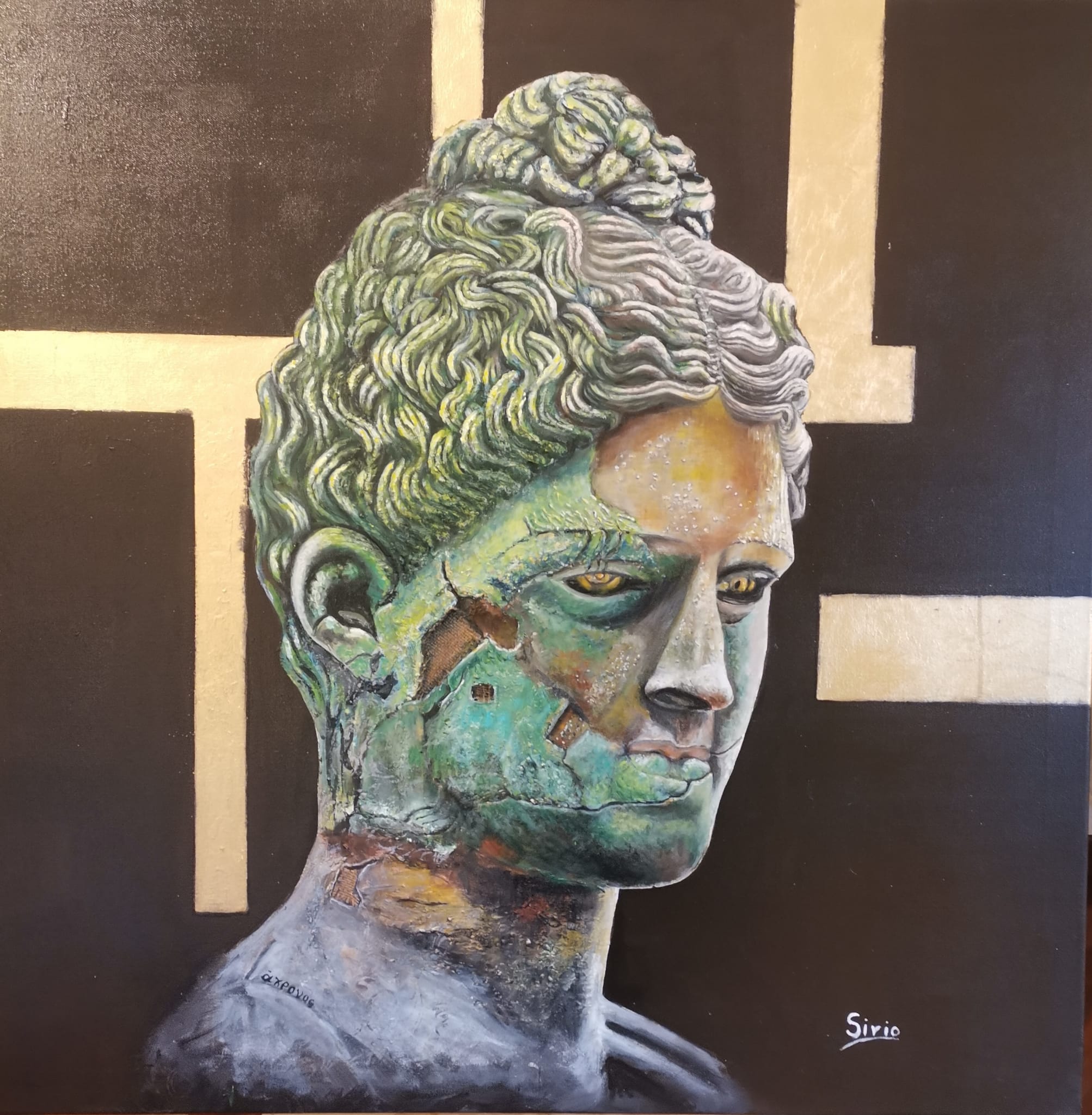 L’artista ha intuito infatti in ogni figura, l’aspetto peculiare della fisiognomica e ritrattistica greca, svelando il portato psicologico delle espressioni e delle posture come rivelatori della natura interiore che la Sirio ha letto e tutt’ora legge nell’opera facendola nuova, riscrivendone il mito, infatti, con la luce dei pigmenti diffusa sul modellato della barba e delle ciocche ordinate del Cronide di Capo Artemisio, ci trasmette la divinitàdel figlio di Crono, nell’Efebo di Maratona la lucentezza del nastro che esalta la testa reclinata, esprime la dolcezza, nell’Efebo di Fano la nudità degli eroi esalta la quasi semidivinità, l’Efebo di Anticitera dalla scura e calda tonalità del bronzo rappresenta la solidità del corpo e della mente e la luce dorata ne esalta la grazia e la maestosità, il Satiro danzante di Mazara del Valloesterna l’aspetto dionisiaco della vita che esula da ogni regola, anche quella dell’armonia classica, la Testa di Apollo di Salerno esala l’ispirazione del Dio delle Arti, la Testa del Filosofo di Anticitera, trasuda autorevolezza e saggezza dai lineamenti importanti, l’Atleta di Lussino, sotto una luce più chiara e traslucida come il sudore, tradisce lo stato di pacata soddisfazione dopo la fatica sportiva, la Testa Barbata di Brindisi di Punta Serrone riferisce alla profondità dell’intelletto, gli Elmi Corinzi di Gela alla fedeltà dei soldati.