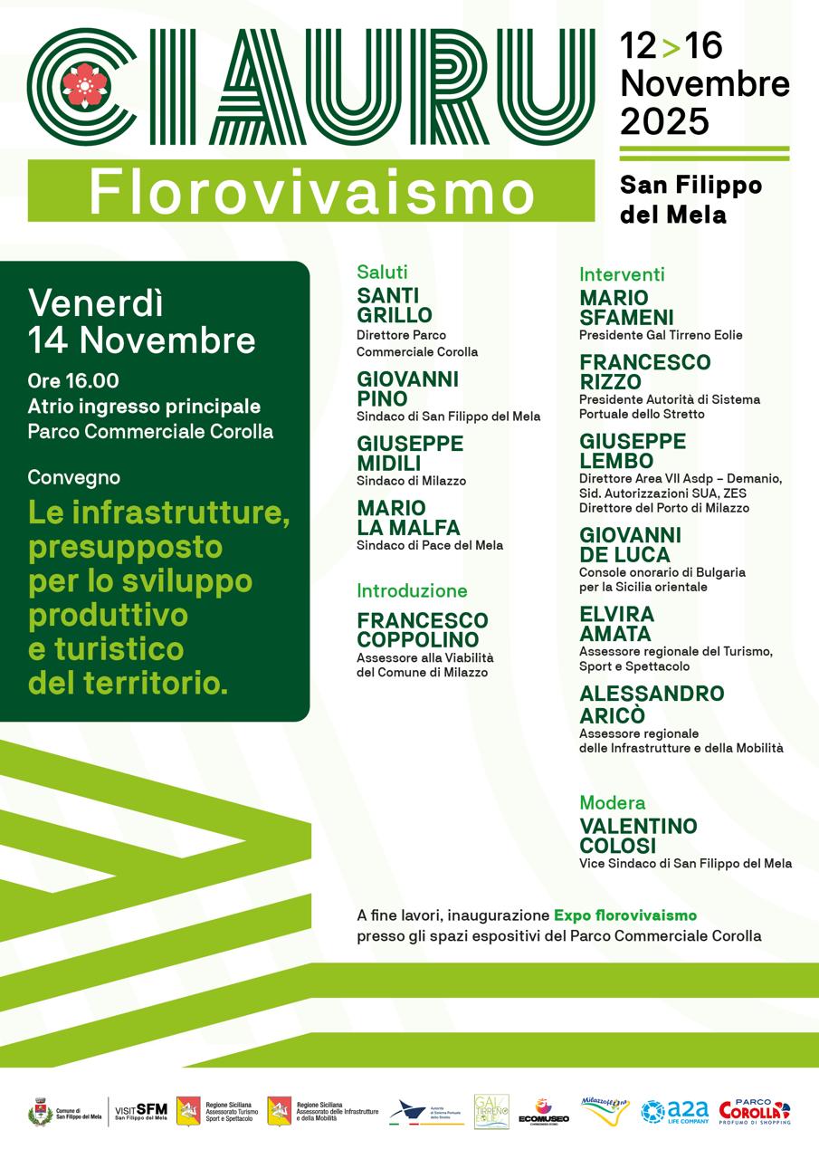 Di logistica del settore vivaistico si parlerà invece nel corso del convegno “Le infrastrutture, presupposto per lo sviluppo produttivo e turistico del territorio“, in programma venerdì 14 novembre, alle ore 16.00, un argomento riguardante, secondo il sindaco Gianni Pino, “la vera sfida da superare per il territorio, in condivisione con i comuni vicini, in particolare Milazzo e Pace del Mela e con i vertici dell’amministrazione regionale”.