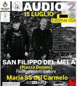 Entrano nel vivo i festeggiamenti in onore di Maria Santissima del Carmelo, celeste patrona della città di San Filippo del Mela. Dopo le due serate di pienone a piazza Fulci, teatro lunedì dell’esibizione dell’Associazione teatrale Le Nuove Immagini con la commedia brillante “L’arte della beffa” e ieri sera della bella musica degli Atmosfera Blu, c’è grande attesa questa sera per il concerto degli Audio 2 in programma alle 21.30 a Piazza Duomo.