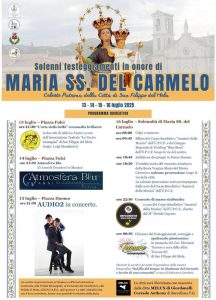 I festeggiamenti in onore della Patrona di San Filippo del Mela culmineranno domani, giorno in cui si celebra la solennità della Madonna del Carmelo. Per l’occasione la città vivrà un momento molto importante: l’accoglienza del reliquiario della Madonna delle lacrime, accompagnato da S.E. Rev.ma Mons. Francesco Lomanto, arcivescovo metropolita di Siracusa, che celebrerà il solenne Pontificale. Nel pomeriggio, inoltre, la trionfale uscita del simulacro della Vergine e la solenne processione per le vie della città. A seguire il concerto di musiche sinfoniche del corpo bandistico “Amatori della Musica” dell’UPCF diretto dal maestro Davide Capone e lo spettacolo pirotecnico in memoria del Cav. Giovanni Tumore, a cura della ditta filippese di fuochi d’artificio.