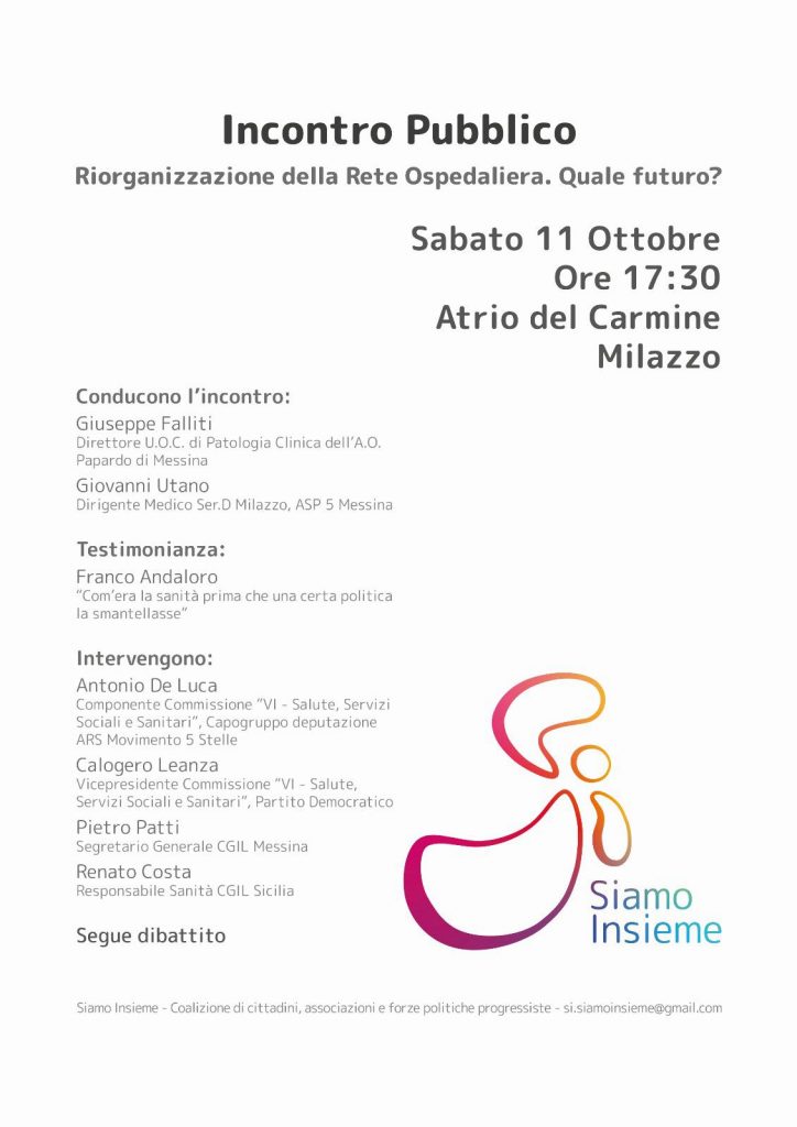 La coalizione SI “Siamo Insieme” – che riunisce cittadini, associazioni e forze politiche progressiste – invita la stampa e i cittadini a dare il loro apporto, con domande e idee, nell’incontro pubblico che avrà luogo sabato 11 ottobre alle ore 17:30 presso l’Atrio del Carmine. “Si discuterà della questione sanitaria, in ordine alla riorganizzazione della rete ospedaliera.