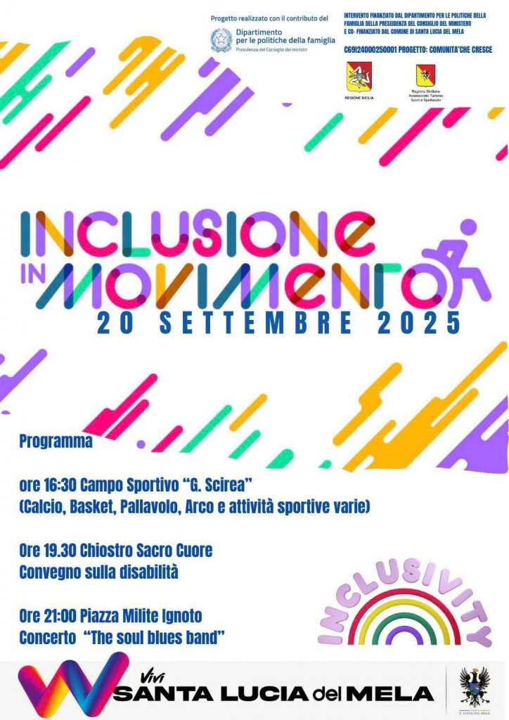 Una giornata all’insegna dello sport, dell’inclusione e della partecipazione collettiva. È questo lo spirito dell’evento “Inclusione in Movimento”, promosso dall’Assessorato allo Sport del Comune di Santa Lucia del Mela, in programma sabato 20 settembre presso il Campo Sportivo Comunale “Gaetano Scirea”.