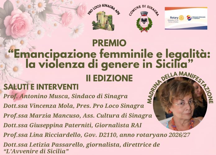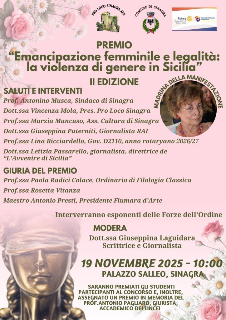 La premiazione e il relativo convegno si terranno Mercoledì 19 Novembre 2025, alle ore 10:00 nella sala conferenze del Palazzo Salleo di Sinagra, e interverranno all’evento: Prof. Antonino Musca, Sindaco di Sinagra Dott.ssa Vincenza Mola, Pres. Pro Loco Sinagra Prof.ssa Marzia Mancuso, Ass. Cultura di Sinagra Dott.ssa Giuseppina Paterniti, Giornalista RAI e Madrina dell’evento Prof.ssa Lina Ricciardello, Gov. D2110, anno rotaryano 2026/27 Dottoressa Letizia Passarello, giornalista, direttrice de “L’avvenire di Sicilia” Prof.ssa Paola Radici Colace, Ordinario di Filologia Classica Prof.ssa Rosetta Vitanza, Presidente Rotary Capo d’Orlando Maestro Antonio Presti, Presidente Fiumara d’Arte Esponenti delle Forze dell’Ordine Modera l’evento la Dott.ssa Giuseppina Laguidara, Scrittrice e Giornalista Durante lo svolgimento della premiazione verrà assegnato un premio in memoria del prof. Antonio Pagliaro, giurista, accademico dei lincei.