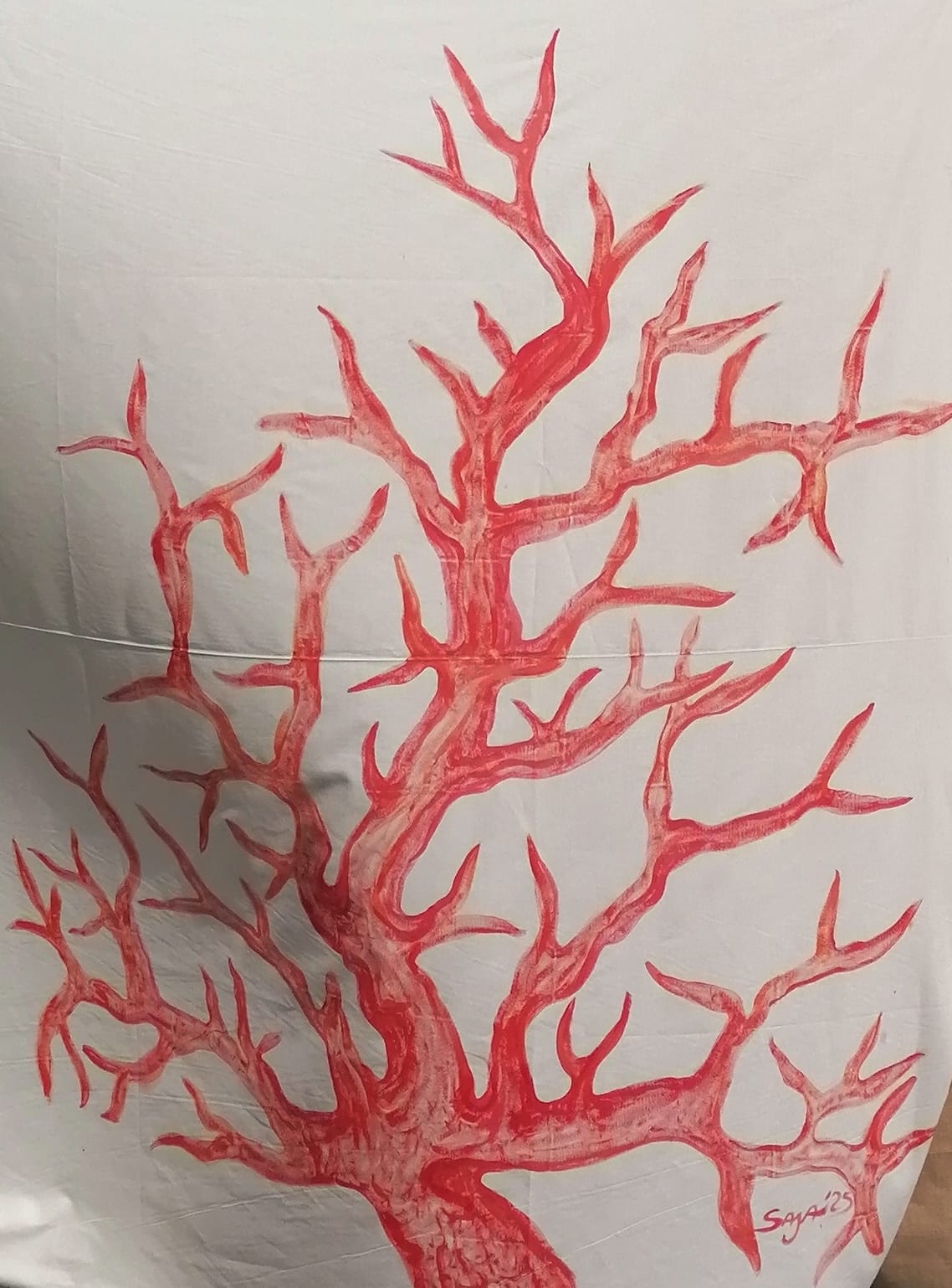 L’opera ( un pannello di grandi dimensioni, 275 cm x 900 cm, acrilico su tessuto ) è stata creata per un evento che suggella l’Amore, il matrimonio di due cari amici dell’artista. Una Sirena, soggetto spesso ricorrente, immersa nei Coralli si libra in preghiera in favore del Creato e delle sue Creature.