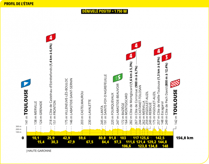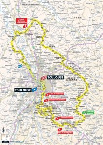 Il percorso della tappa si può idealmente dividere in due sezioni ben distinte. La prima metà è piuttosto semplice e scorrevole, adatta a un avvio controllato e alla formazione dell’eventuale fuga. I corridori lasceranno Tolosa affrontando una ventina di km pianeggianti prima di trovare il primo GPM ufficiale della giornata, la Cote de Castelnau d’Estretefonds (1,4 km al 6,6%, pendenza massima del 9,9%), situata al km 25,9.