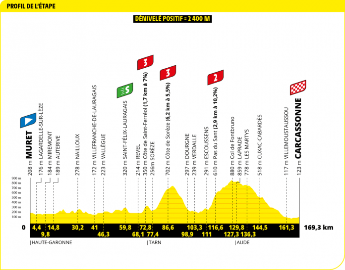 Muret – Oggi il Tour de France 2025 chiuderà la sua seconda settimana con una tappa disegnata per i cacciatori di successo da lontano. I 169,3 km tra Muret e Carcassonne si annunciano come terreno ideale per gli attaccanti, in una frazione dal profilo movimentato ma non estremo, con quasi 2500 metri di dislivello e tre GPM collocati nella seconda metà del percorso. Un tracciato che scoraggia i velocisti puri e non stimola troppo gli uomini di classifica, il che spalanca le porte a una giornata di azione da lontano. La partenza da Muret non proporrà subito grandi difficoltà, ma dopo 15 km inizierà una fase mossa, con continui saliscendi e brevi strappi, il contesto ideale per vedere nascere la fuga di giornata. Il primo vero punto d’interesse sarà il traguardo volante di Saint-Felix-Lauragais, posto al km 59,8, che potrebbe offrire un obiettivo intermedio agli uomini interessati alla classifica a punti. Dopo questo settore, il percorso cambierà volto con l’inizio delle principali asperità della giornata. La Cote de Saint-Ferreol, con i suoi 1,7 km al 7% (e punte del 9,4%), aprirà ufficialmente la