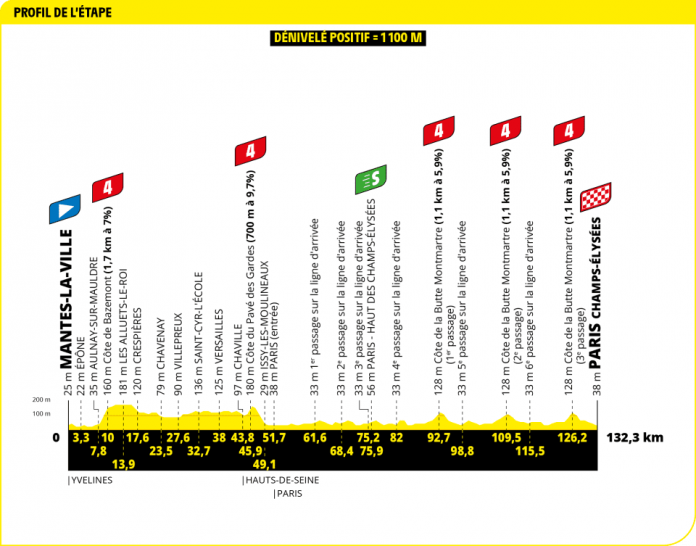 La 21a tappa partirà da Mantes-la-Ville e si snoderà per 132,3 km tutt’altro che banali. Già dopo pochi chilometri si salirà sulla Cote de Bazemont (1,7 km al 7%). Dopo una fase centrale più scorrevole, il gruppo affronterà un nuovo scoglio, la Cote du Pavé des Gardes, un “muro” di 700 metri con pendenza media del 9,7%, situato poco prima dell’ingresso nel territorio parigino. Da lì, al km 61,6, si transiterà per la prima volta sotto il traguardo degli Champs-Elysees, preludio a una parte finale completamente nuova. I corridori affronteranno dapprima tre giri del tradizionale circuito parigino da 6,8 km, con il traguardo volante piazzato al km 75,9. Poi, dal quarto passaggio in avanti, tutto cambierà. Verrà introdotto un anello più ampio da 16,8 km che includerà la Cote de la Butte Montmartre (1,1 km al 5,9%), salita tecnica e affascinante che si affronterà tre volte. L’ultimo scollinamento, situato a 6 km dal traguardo, sarà probabilmente decisivo per determinare l’esito della corsa. A -5 km dal traguardo scatterà la zona neutralizzata per la classifica generale, e l’ultimo chilometro sarà segnato da una curva secca a destra in Place de la Concorde.