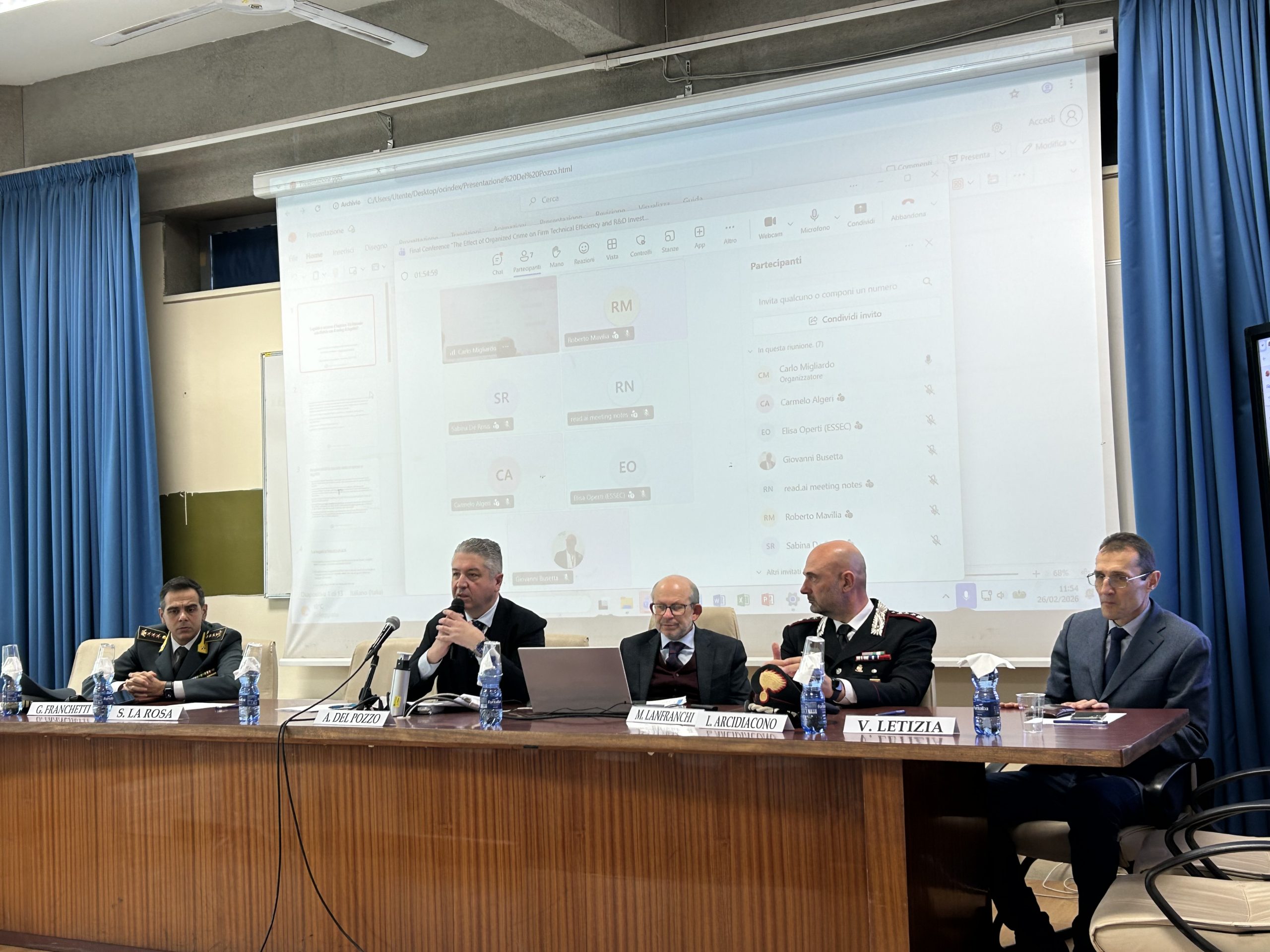 Il fulcro dei lavori, svolti in collaborazione con l’Università Mediterranea di Reggio Calabria e l’Università per Stranieri “Dante Alighieri”, è stato lo studio condotto dal Prof. Migliardo insieme al Prof. Antonio Fabio Forgione, pubblicato sul Journal of Regional Science, che quantifica con sofisticate tecniche econometriche l’impatto dell’infiltrazione mafiosa sull’efficienza delle imprese di ingegneria civile italiane, analizzando 2.415 aziende nel periodo 2014-2019 e costruendo un indice composito della presenza criminale a livello comunale.