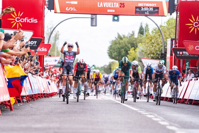 Guijuelo – Jasper Philipsen si è imposto con autorità nello sprint di Guijuelo, al termine della 19a frazione di 161,9 km partita da Rueda. Perfettamente pilotato dai suoi compagni di squadra, Philipsen ha trovato la posizione ideale nel momento decisivo e, nonostante l’arrivo in leggera salita, ha lasciato ben poca possibilità agli avversari. Dietro di lui si sono piazzati Mads Pedersen (Lidl-Trek), generoso nel provare un anticipo a lunga gittata, e il venezuelano Orluis Aular (Movistar), sempre più costante con il terzo podio in questa edizione della corsa spagnola. Per gli uomini di classifica è stata una giornata tranquilla, senza scossoni. L’unico movimento degno di nota è arrivato al traguardo volante di Salamanca, dove Jonas Vingegaard (Visma-Lease a Bike) ha colto quattro preziosi secondi di abbuono, consolidando la Maglia Rossa. Il danese guida ora con 44″ di vantaggio su Joao Almeida (UAE Team Emirates XRG) e 2’43” su Tom Pidcock (Q36.5 Pro Cycling Team), in attesa della durissima frazione di montagna in programma domani. La tappa si è accesa subito con l’attacco solitario di Jakub Otruba (Caja Rural-Seguros RGA), a cui ha inizialmente provato ad accodarsi Victor Guernalec (Arkéa-B&B Hotels), poi rapidamente desistito. Otruba ha guadagnato fino a 4 minuti, ma la sua azione è stata sempre tenuta sotto controllo dal gruppo, condotto dalle squadre dei velocisti, con Alpecin-Deceuninck e Lotto in prima fila. Il vento laterale ha creato qualche attimo di tensione a metà corsa, spingendo anche UAE e Visma a mettersi davanti per proteggere i capitani, ma non è stato abbastanza forte da provocare vere spaccature. La fuga di giornata si è esaurita a 51 km dal traguardo, quando il gruppo ha riassorbito Otruba. Un tentativo successivo di Mario Aparicio e Sergio Chumil (Burgos-BH) non ha avuto più fortuna, durando appena pochi chilometri. Da lì in avanti, la corsa è stata completamente nelle mani delle squadre dei velocisti, con Lidl-Trek, Movistar, Lotto e Alpecin a contendersi le posizioni nelle prime file. Il treno della Ineos Grenadiers ha provato a sorprendere tutti, lanciando Filippo Ganna in testa fino all’ultimo chilometro per Ben Turner. Il verbanese ha allungato il gruppo con una progressione poderosa, ma ha dovuto arrendersi negli ultimi 600 metri. È stato allora che l’Alpecin-Deceuninck ha piazzato la propria volata perfetta: Philipsen ha preso la scia giusta, ha controllato il tentativo di anticipo di Pedersen e ha chiuso con la sua consueta potenza, andando a prendersi la terza vittoria in questa Vuelta.