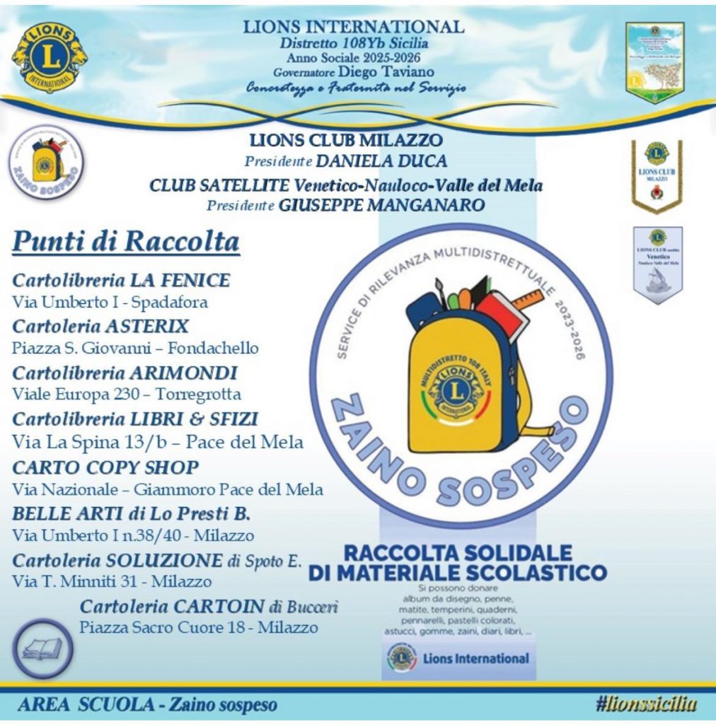 Anche quest’anno l’iniziativa “Zaino Sospeso” portata avanti dal Lions Club Milazzo: Presidente Daniela Duca; Club Satellite Venetico Nauloco Valle del Mela, Presidente Giuseppe Manganaro e Leo Club Milazzo, Presidente Francesco Smedile ha dimostrato quanto la solidarietà possa trasformarsi in un gesto concreto di vicinanza e comunità.